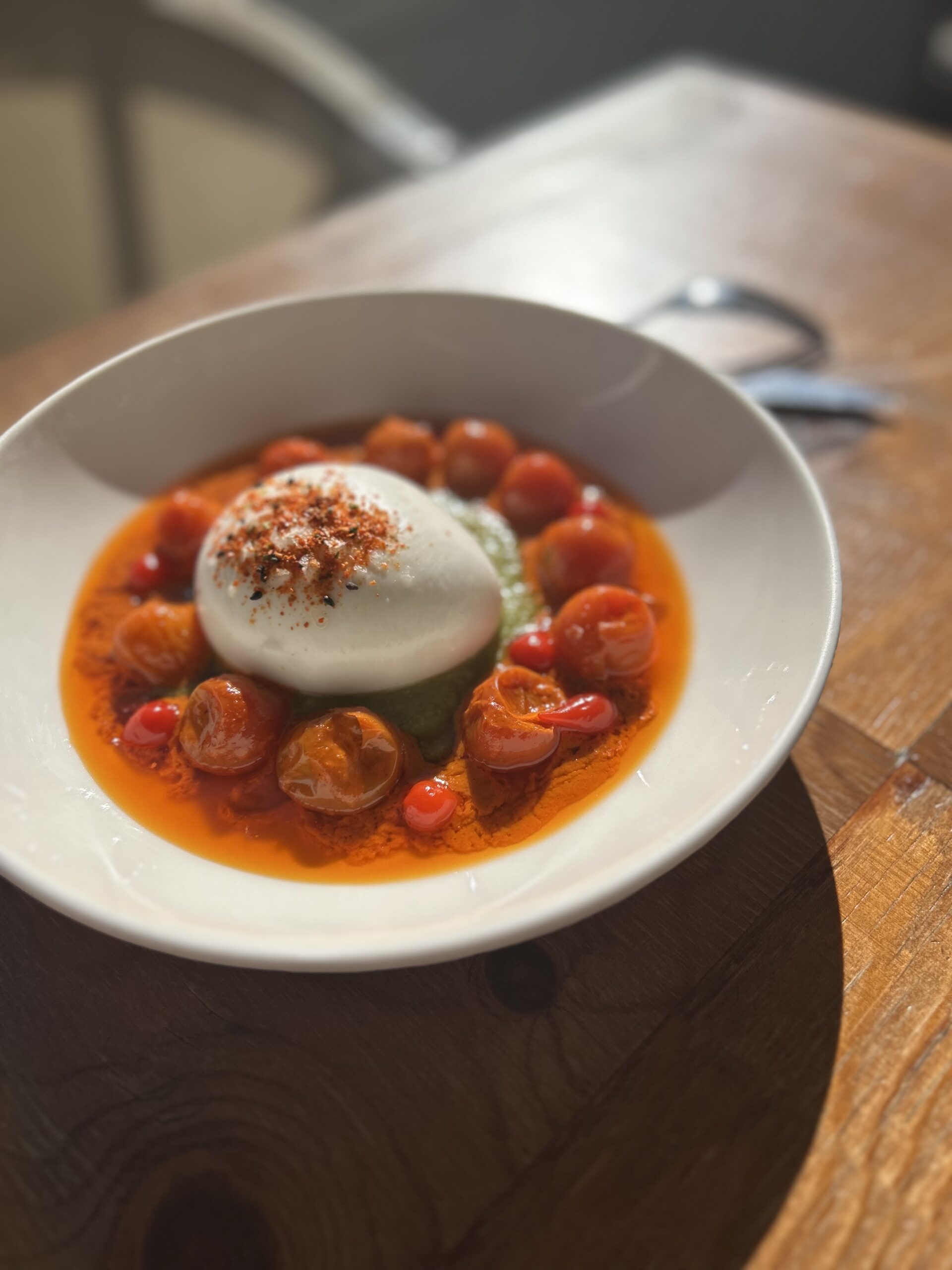 • Burrata con tomate cherry confitado, pimiento lágrima y pesto casero